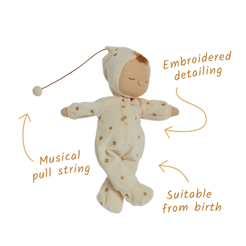Twinkle, Twinkle Little Star, Lullaby Dozy Dinkums, here you are. With the same huggable, soft, comforting design as the most-loved Dozy Dinkums, Lullaby Lyra comes with a little pompom on the end of their bonnet which when pulled plays a sleepy tune. A special gift to welcome a newborn baby.