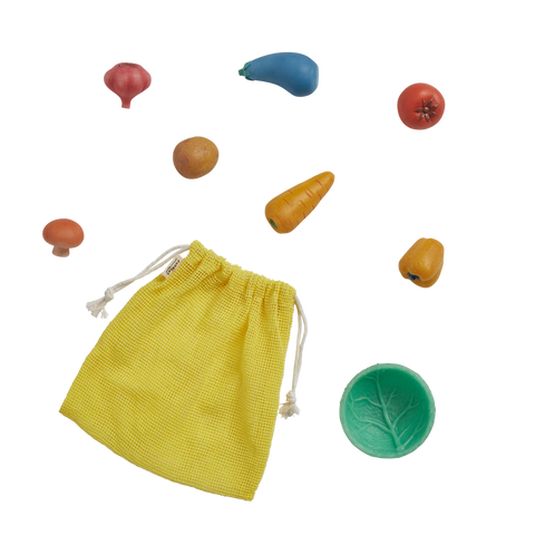 Each set comes packed in a gift-ready box and includes seven sensory stones, a small matching bowl, and a mesh bag to keep the set together, and for easy cleaning. Inside the Vibrant Veggies box, you will find one mushroom, garlic, eggplant, tomato, carrot, capsicum, and potato.